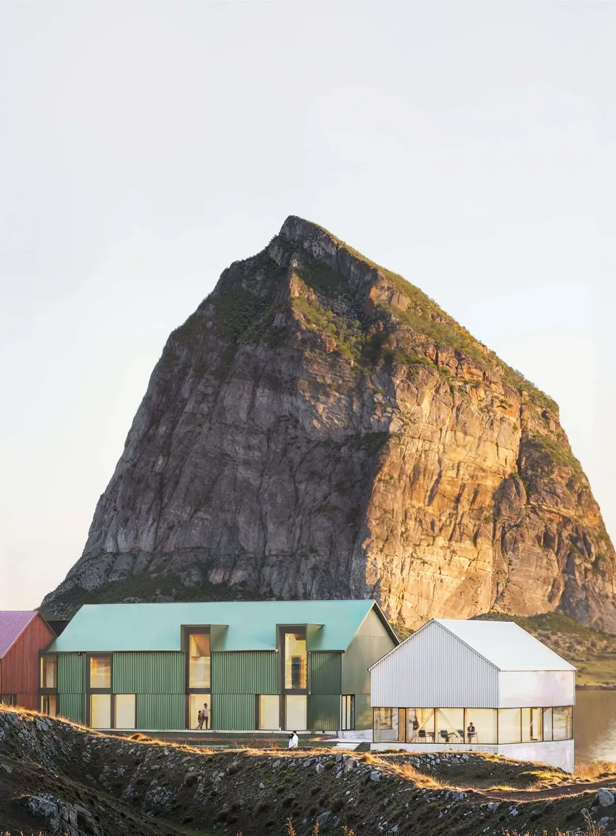 The architecture is inspired by the region’s old fishing villages—vibrant seaside settlements with colorful houses, vernacular buildings, wharves, and docks. The hotel is thoughtfully integrated into the landscape, designed in response to the region’s rugged climate. A network of nature trails links the smaller buildings to the surrounding natural areas, weaving together architecture and environment. The project includes a marina, a saltwater spa, and extensive trails, as well as workspaces for local businesses and artists.